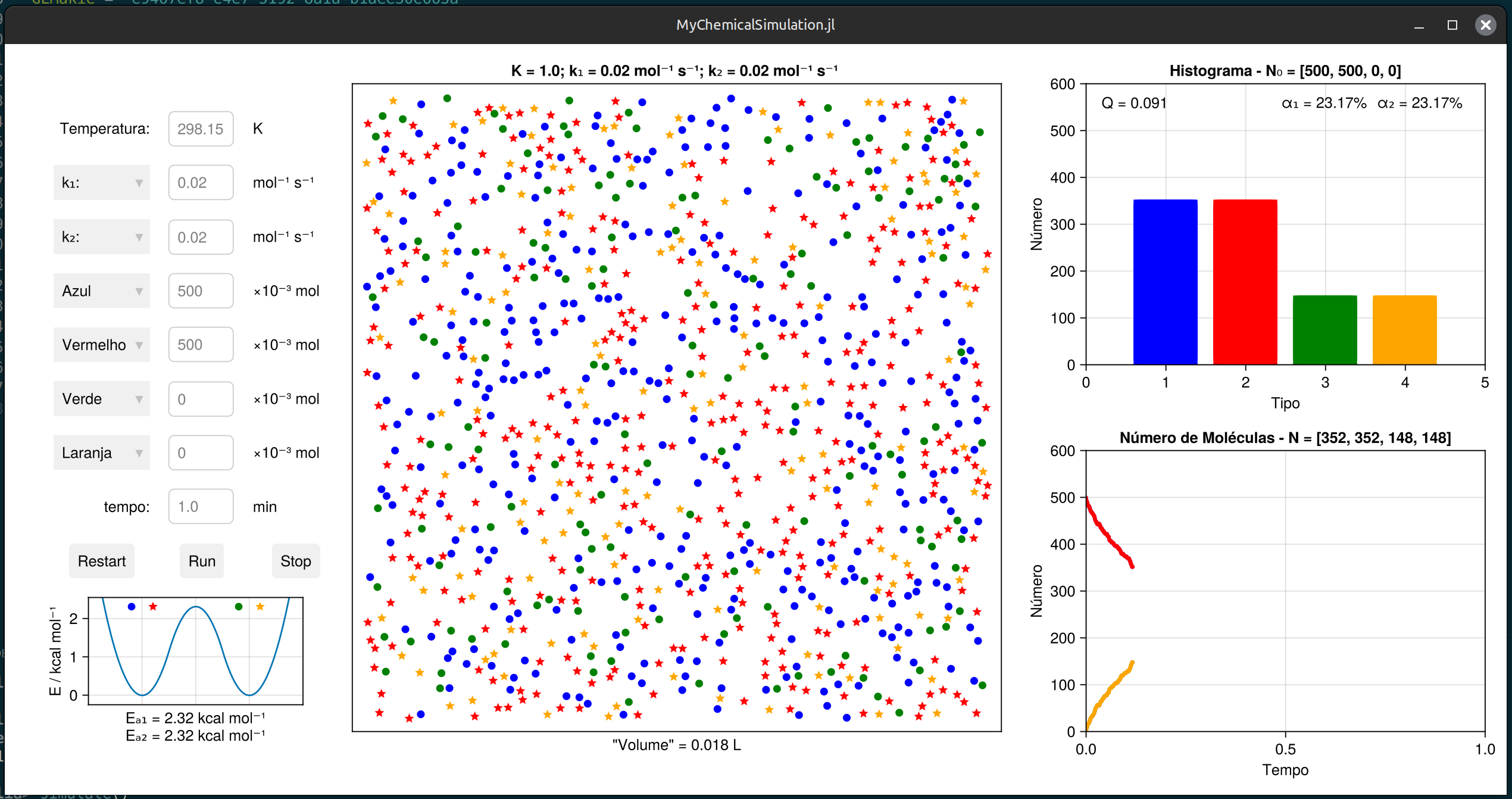 Este programa é um laboratório virtual onde você pode ver como as reações químicas acontecem molécula por molécula. Ele simula uma reação do tipo A + B ⇋ C + D, onde duas moléculas diferentes (A e B) se encontram, reagem e formam duas novas moléculas (C e D).